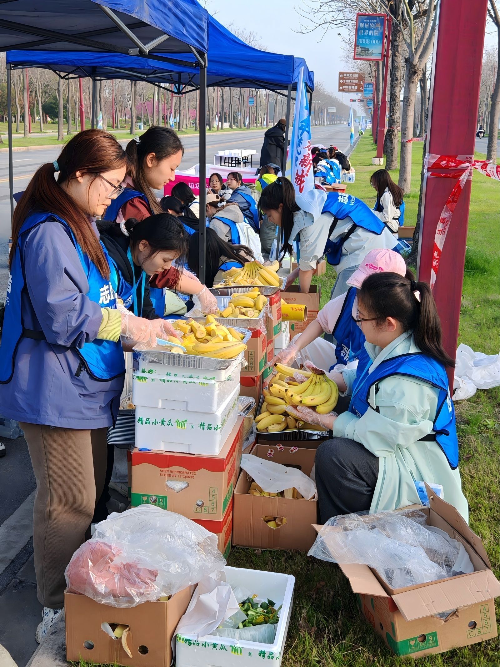 赛事当天,志愿者们早早集结、迅速行动,奔赴各个补给站及半马、全马终点,有序开展赛前筹备工作。