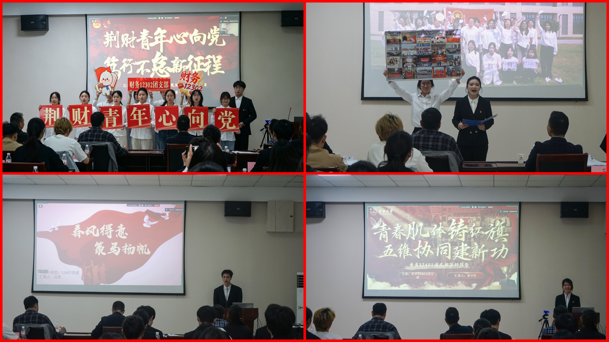 食卓32401团支部以“大脑领航、骨骼强基、心脏赋能、双手践行、血脉凝心”为特色路径,创新构建“青春肌体”五维协同工作体系,打造出思想引领与专业实践深度融合的活力团支部。财务12302团支部以“结对共建”打通课堂与职场、以“守护天使”筑起互助共进学风,汇报最后支部成员也来到现场展现了“荆财青年”心向党的支部风采。教育12303团支部以“友爱·友益·友趣”为理念,打造“三人行”特色班团会品牌,彰显团支部青春活力。中师(师范)12401团支部创新开展国学实践、诗词赏析、书法展示等特色活动,在思想引领与学风建设中彰显“春风得意,策马扬帆”的青春担当。